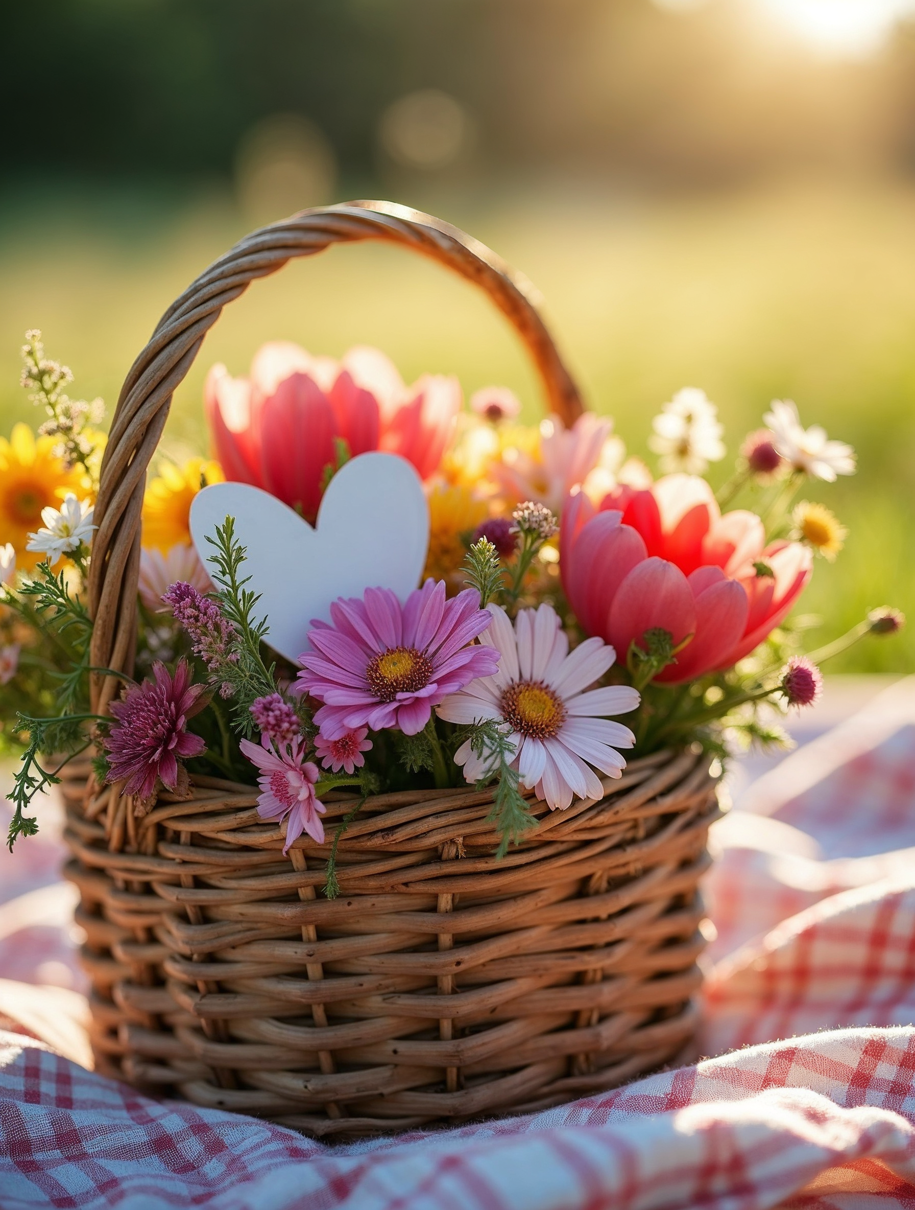 A wicker basket filled with vibrant flowers including pink tulips, daisies, and various blooms sits on a red checkered picnic blanket. A large white paper heart is tucked among the flowers. The scene is set in a sunny green field with golden sunlight in the background.