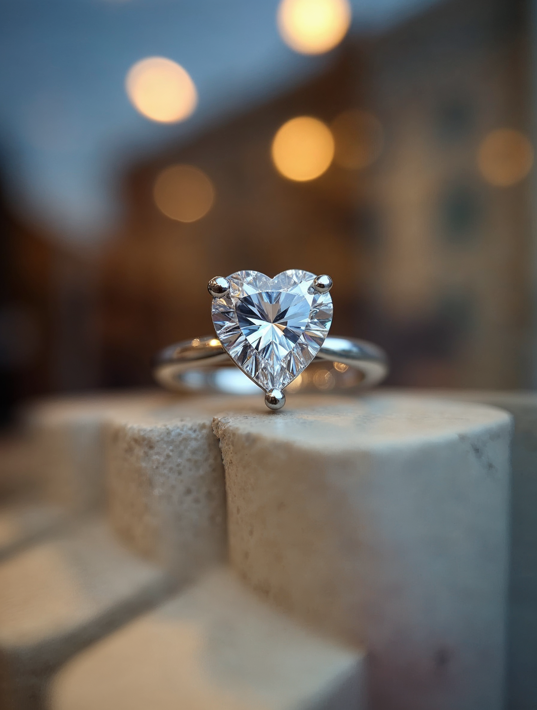 A stunning heart-shaped diamond ring sits on a textured stone surface. The brilliant white diamond is set in a silver band with prongs securing the gem. Blurred warm bokeh lights and urban background create a romantic glow.