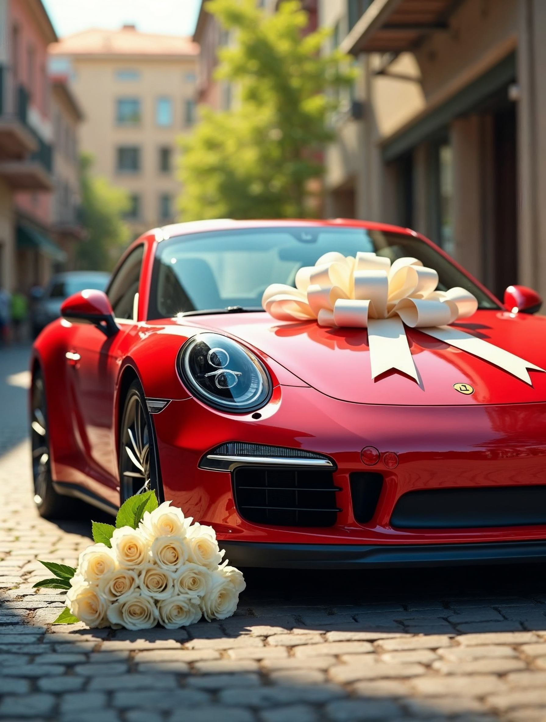 A shiny red Porsche sports car is parked on a cobblestone street in an urban setting with European-style buildings and trees in the background. It is decorated with a large white satin bow on the hood and a bouquet of white roses placed in front on the ground. The car features sleek black accents and glossy red paint reflecting the surroundings.