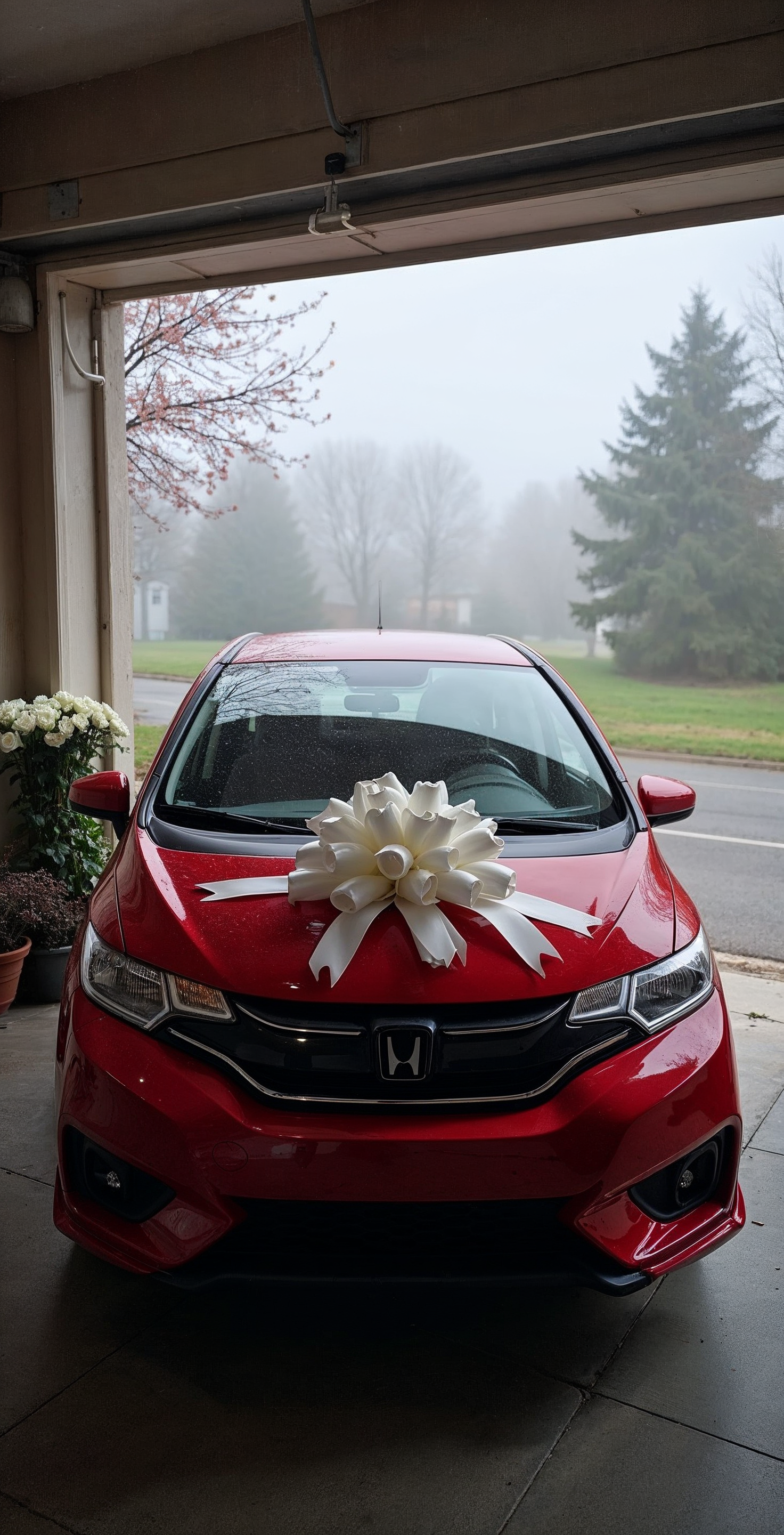 Civic hatchback, Honda, Honda Civic, autumn trees, car gift, driveway, foggy weather, garage, gift bow, large bow, new car, open garage, overcast sky, parked car, pine trees, potted plants, red Honda, white bow, white flowers, red car