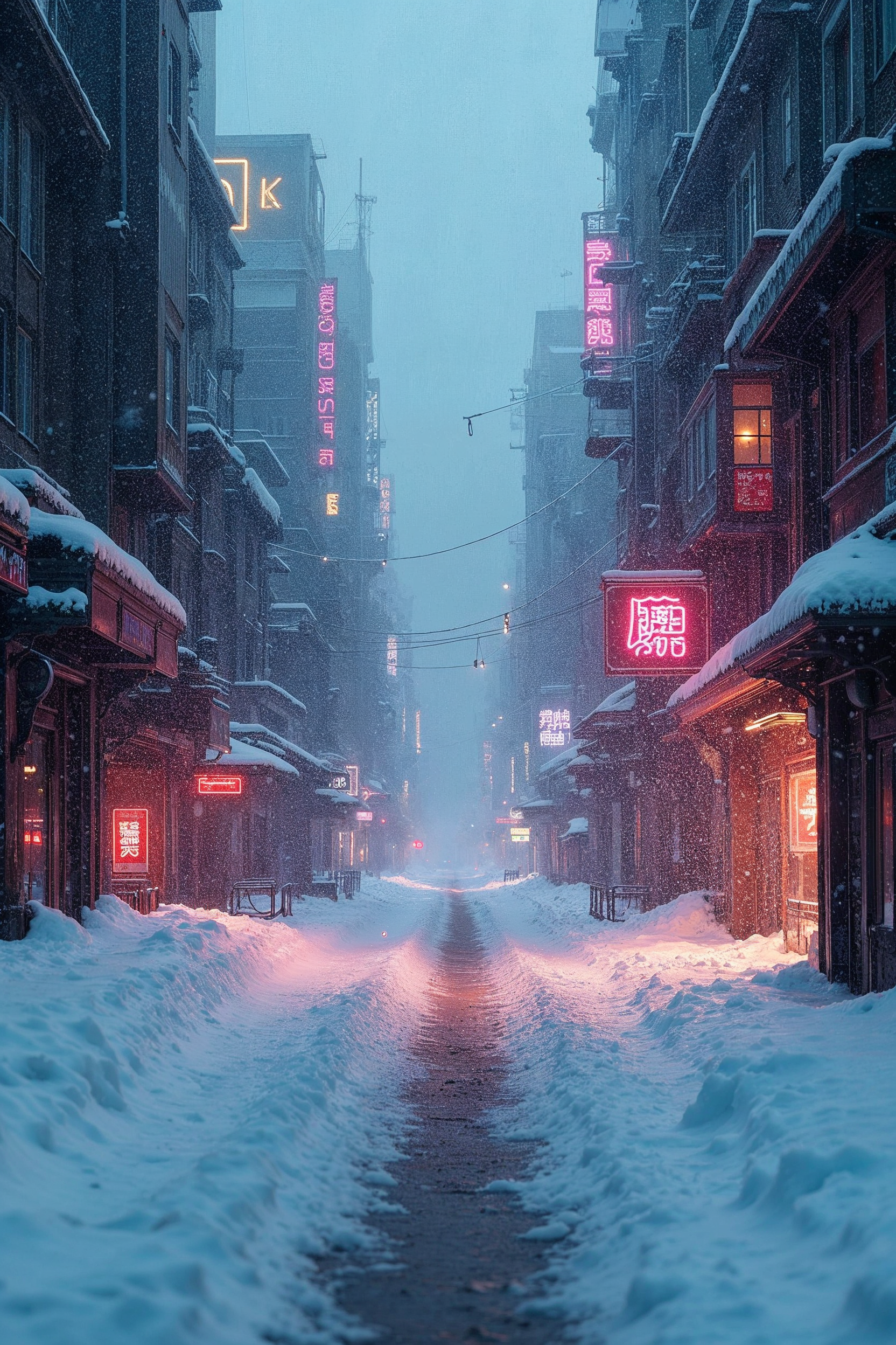 Chinese signs, alleyway, atmospheric, buildings, cityscape, cyberpunk, empty street, fog, illuminated signs, narrow path, neon lights, night, pink neon, power lines, red neon, snow, snowy ground, urban, winter, snowy street