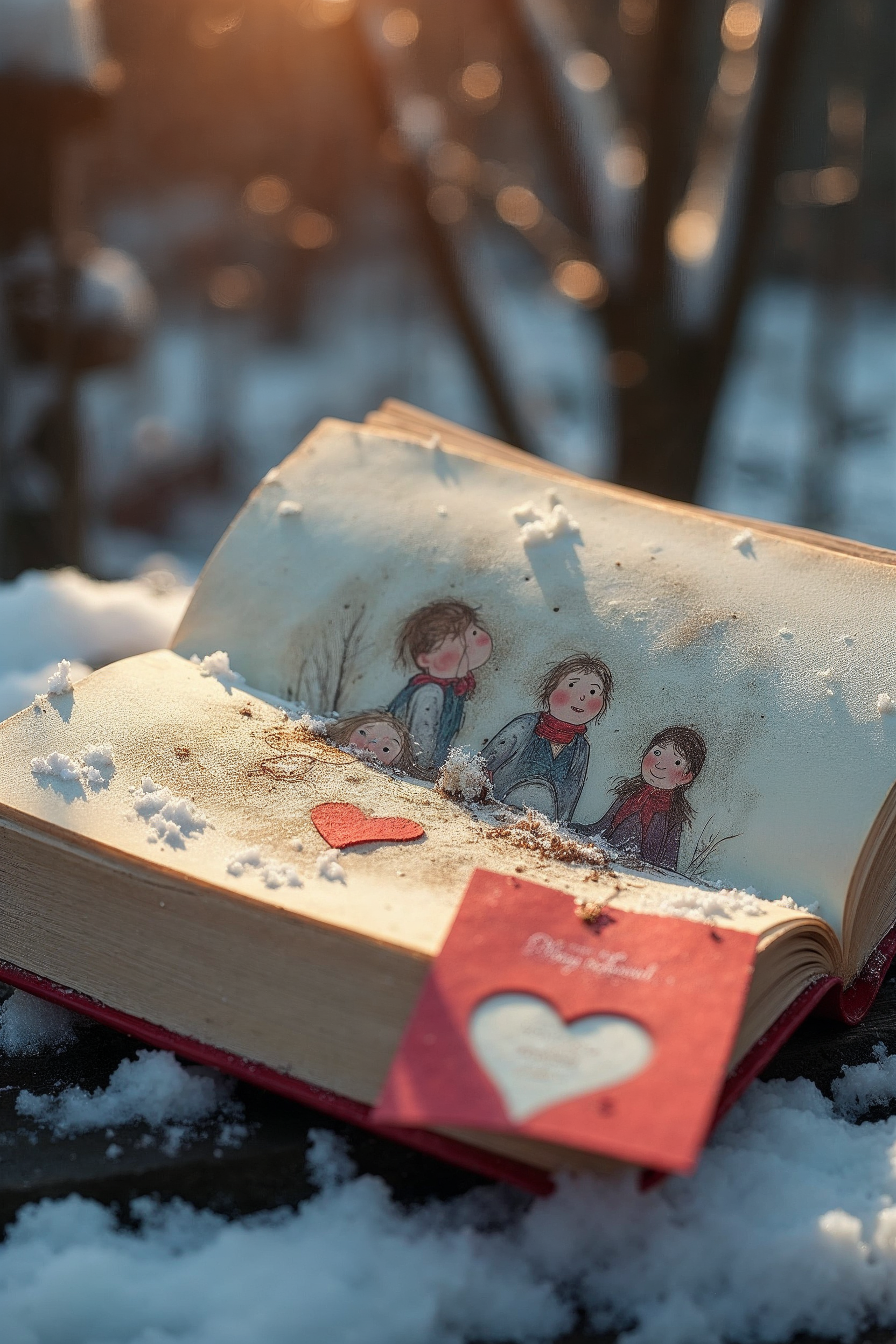 An open book lies on snowy ground with watercolor illustrations of four children huddled together in winter clothes amid falling snow. A red heart-shaped card labeled 'Playland' protrudes from the pages, surrounded by a snowy forest background with bare trees and golden sunlight. Snowflakes dust the book's pages and edges.