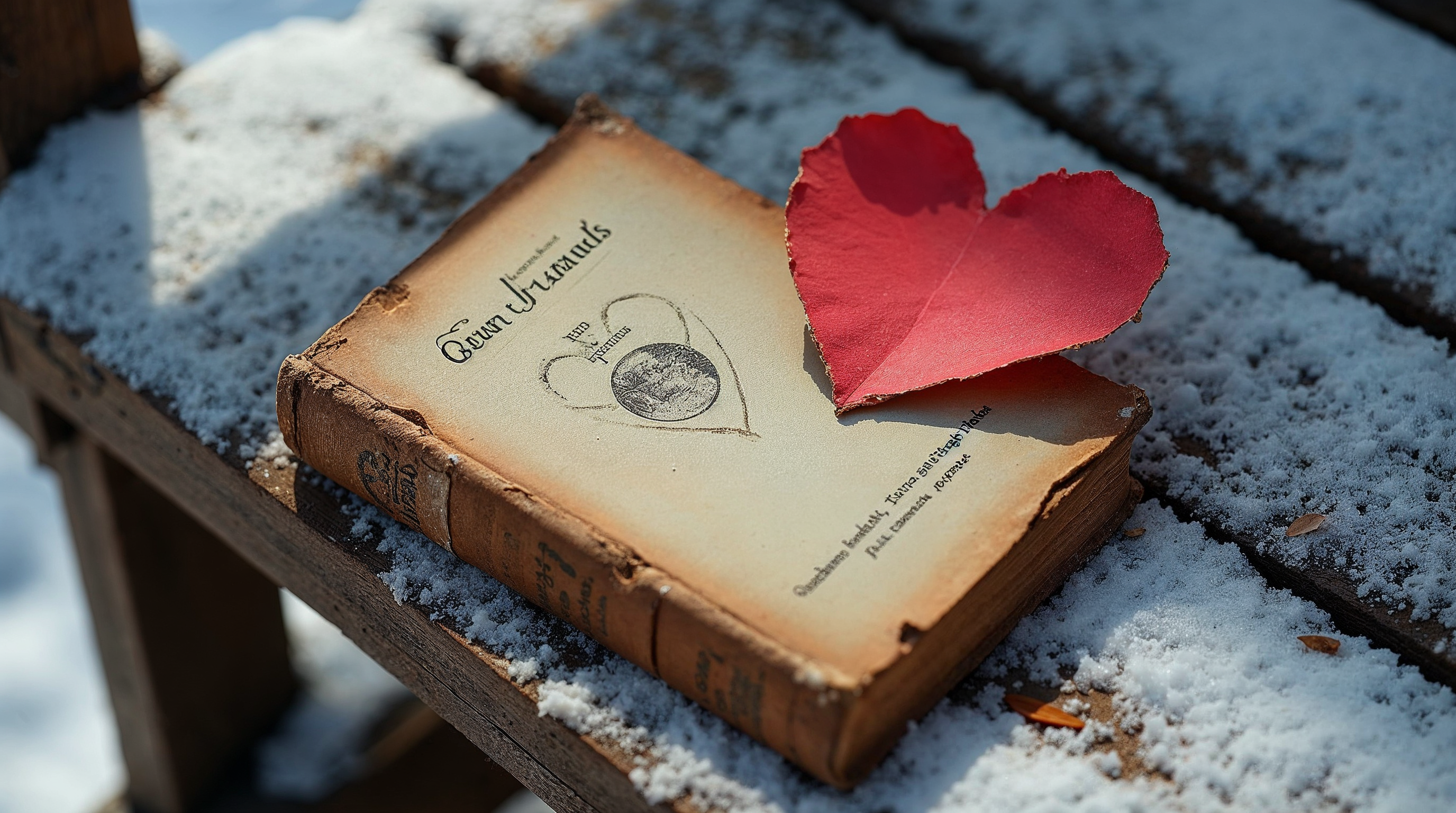 An old, weathered copy of 'Les Misérables' by Victor Hugo lies open on a wooden bench covered in snow. A large red paper heart is placed on top of the book. The scene features a snowy outdoor setting with the bench angled slightly.