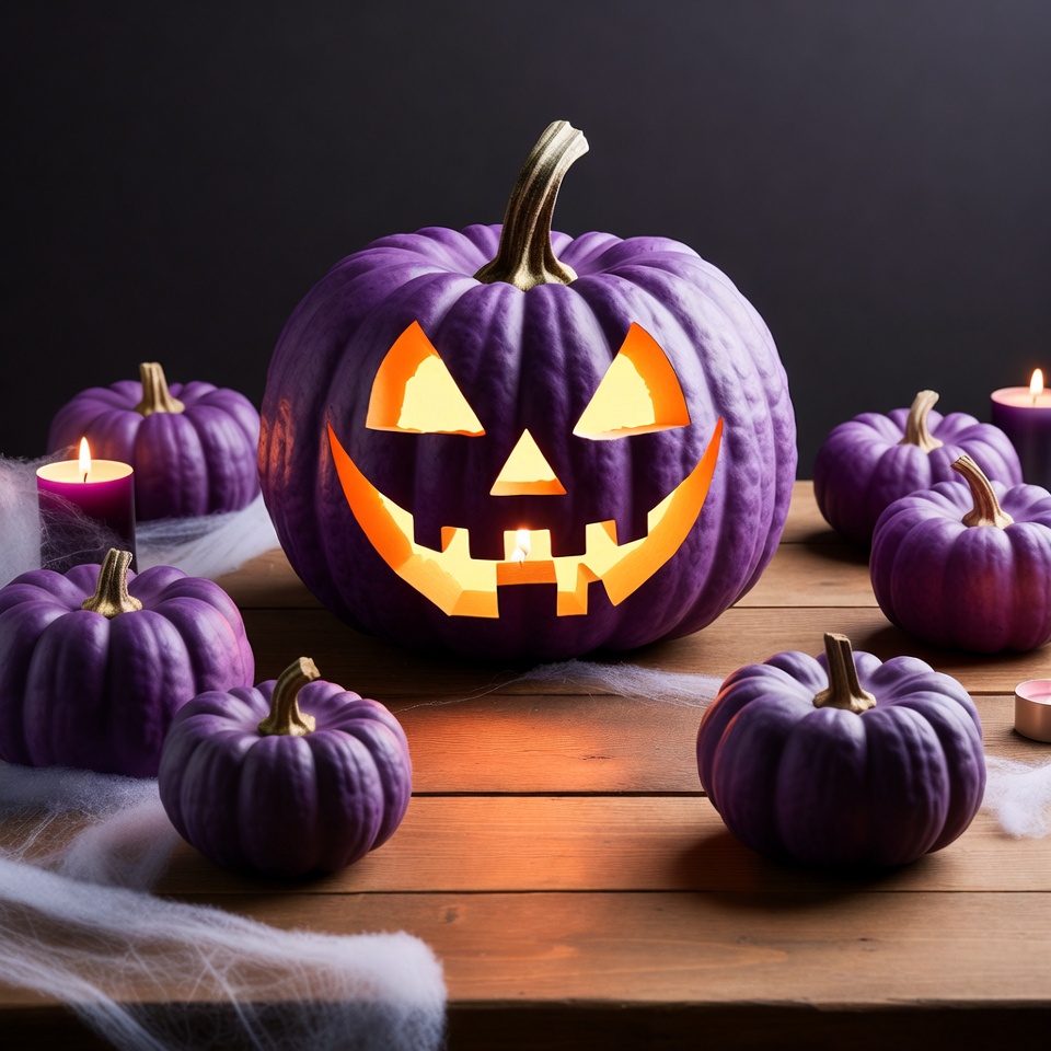 A large purple jack-o-lantern with glowing orange carved face sits on a wooden table surrounded by smaller purple pumpkins. Purple candles flicker nearby amid white cobweb decorations. The dark background enhances the Halloween theme.
