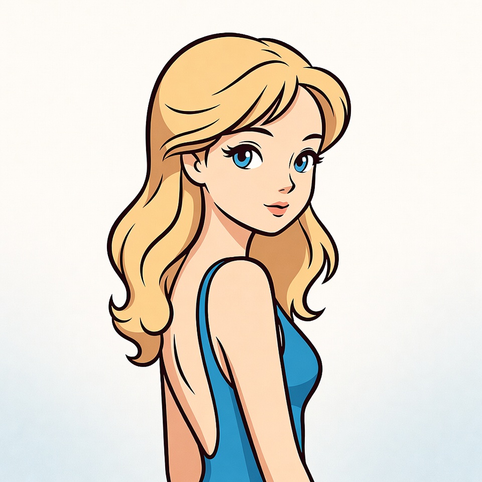A cartoon illustration of a young woman with long blonde hair turned slightly to the side. She wears a form-fitting blue dress with a deep back cutout and smiles gently. Her large blue eyes and fair skin are featured on a plain white background.