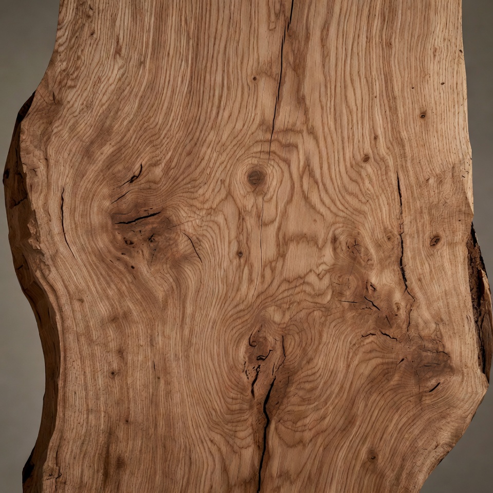 A large slab of live edge oak wood features natural irregular edges and prominent grain patterns. The light brown wood shows detailed knots, cracks, and swirling textures typical of burl formation. It is photographed against a plain gray background.