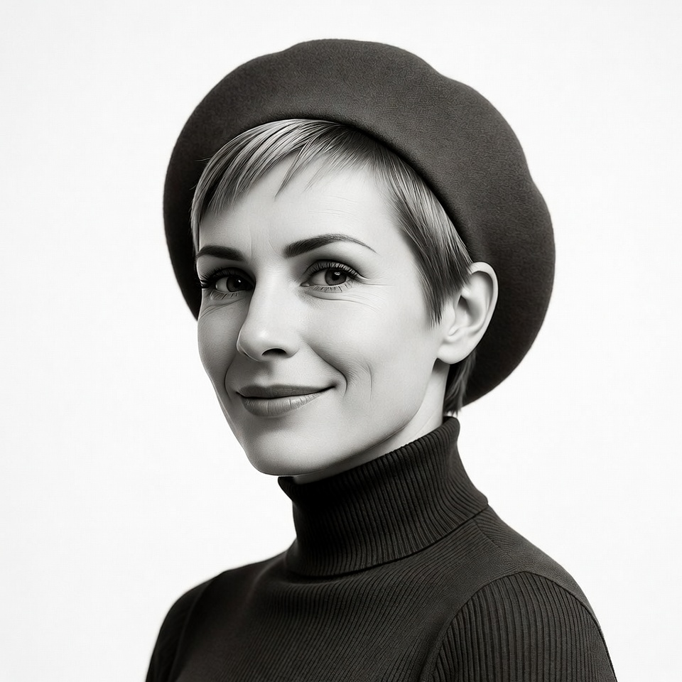 A woman with short blonde hair wears a black beret tilted on her head and a black turtleneck sweater. She has a gentle smile with subtle lipstick and gazes slightly to the side against a plain white background. The black-and-white portrait highlights her fair skin and expressive eyes.