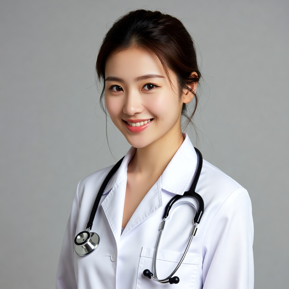 A young Asian woman with dark hair tied in a bun wears a white doctor's coat and smiles at the camera. She has a stethoscope draped around her neck and stands against a plain gray background. Her expression is friendly and professional.