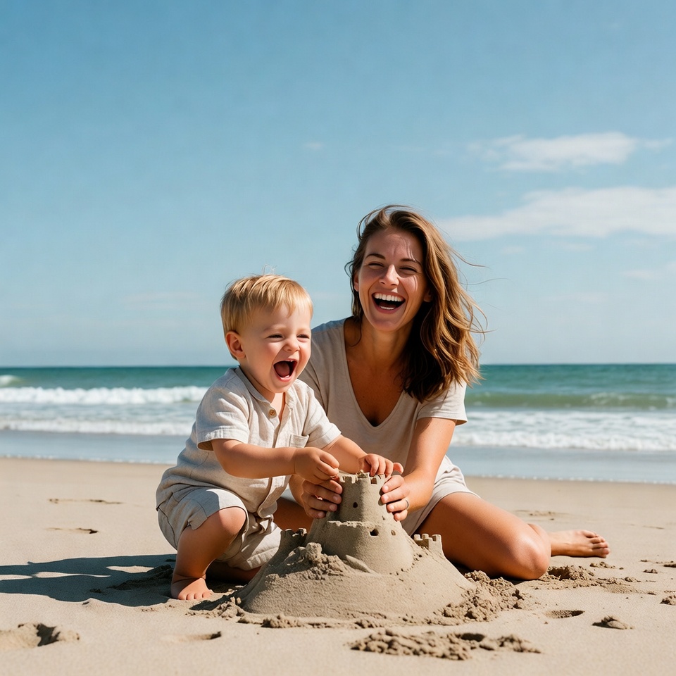A smiling White mother with wavy brown hair and a joyful White toddler boy with blonde hair build a sandcastle together on the sandy beach. They wear matching beige outfits, kneeling in the sand with ocean waves and blue sky in the background. The mother holds the sandcastle while the boy touches it excitedly.