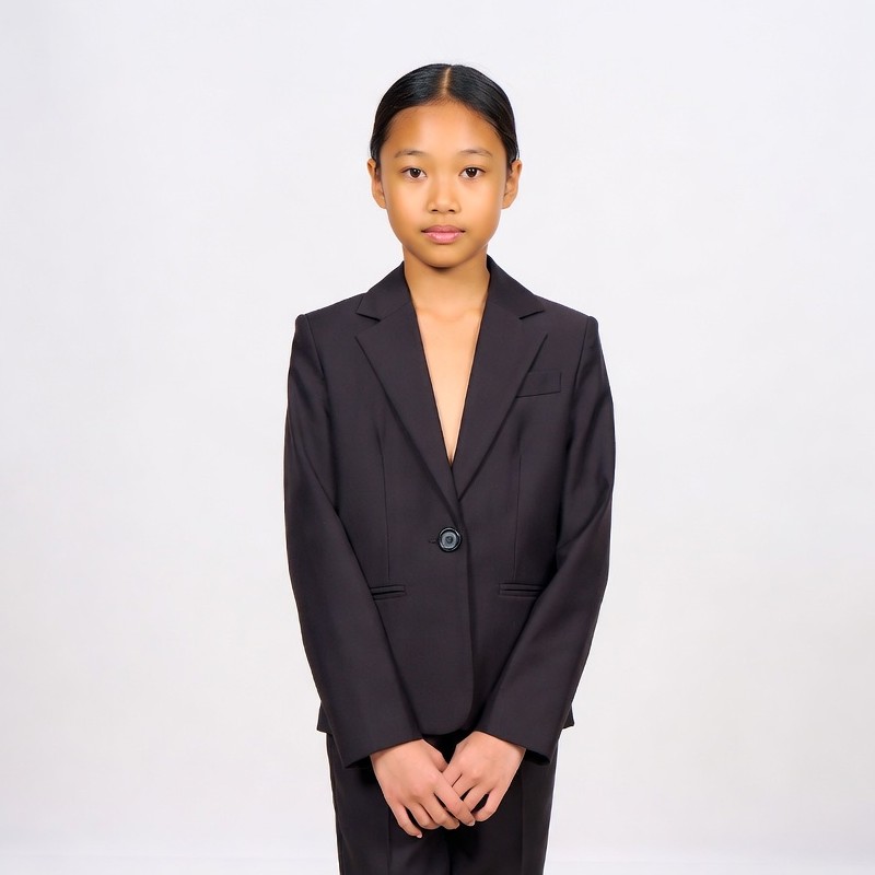 A young Asian girl with straight black hair in a ponytail stands frontally against a white background. She wears a tailored black blazer with a deep V-neck and matching pants. Her hands are clasped in front of her in a formal pose.