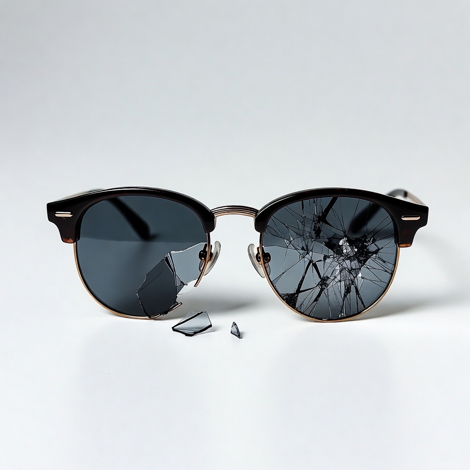 A pair of classic wayfarer-style sunglasses with one intact dark gray lens and the other shattered into pieces. Cracked glass fragments are scattered around the frame on a plain white surface. The brown tortoiseshell frame contrasts sharply with the white background.