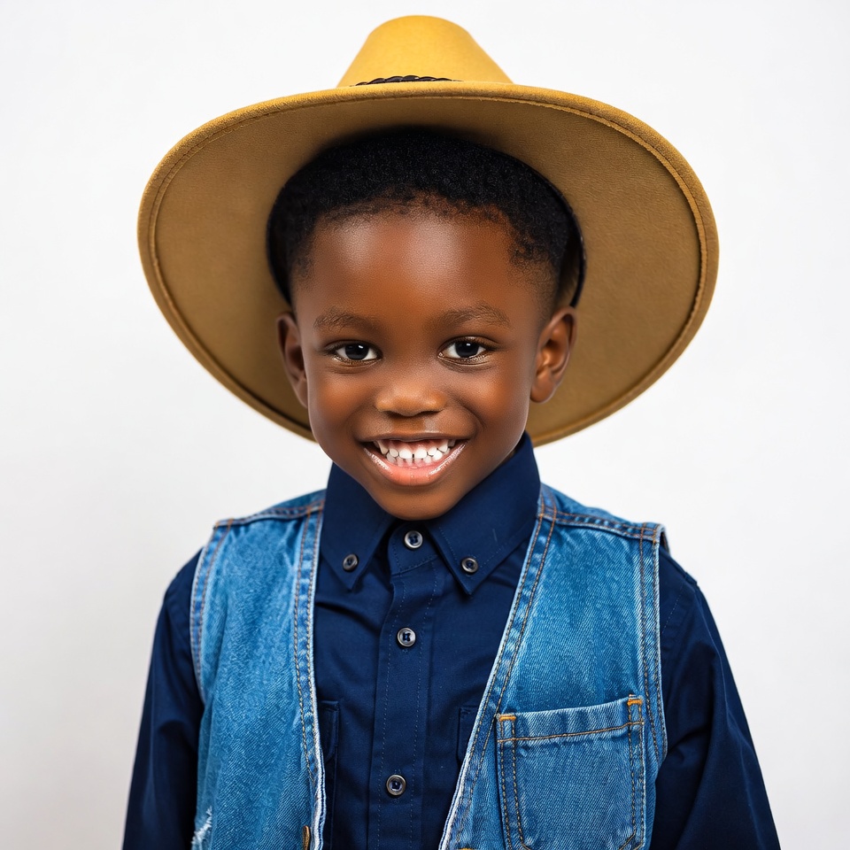 A young African boy with short curly black hair smiles brightly while wearing a large yellow cowboy hat. He is dressed in a blue collared shirt and denim vest, standing against a plain white background. His expressive eyes and wide grin are prominently featured in the close-up portrait.