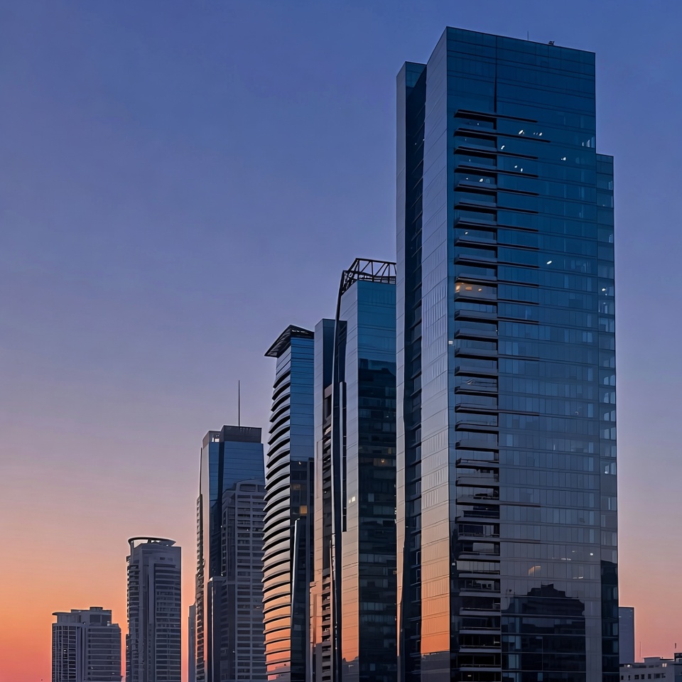 architecture, blue sky, buildings, city skyline, dusk, evening skyline, glass facade, high-rise, illuminated windows, modern buildings, orange sky, sunset, tall towers, twilight, urban architecture, skyscrapers