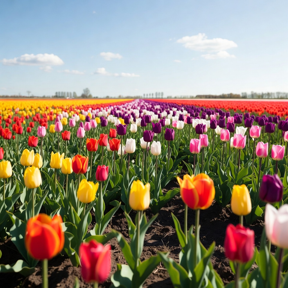 Netherlands tulips, blooming tulips, blue sky, clouds, colorful tulips, field, floral landscape, flower field, flowers, garden flowers, green stems, nature, outdoor, pink tulips, purple tulips, red tulips, rows of tulips, spring flowers, tulip farm, tulip fields, vibrant flowers, white tulips, yellow tulips, tulips