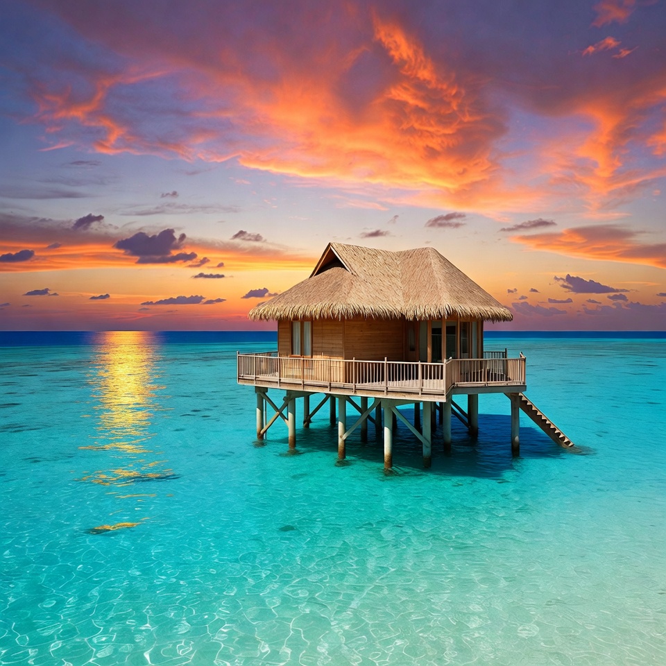 beach house, bungalow, calm water, clouds, deck, island hut, luxury accommodation, ocean, orange sky, paradise, pink clouds, reflection, resort, sea, sky, stilt house, sunset, thatched roof, tropical, turquoise water, vacation, wooden house, overwater bungalow