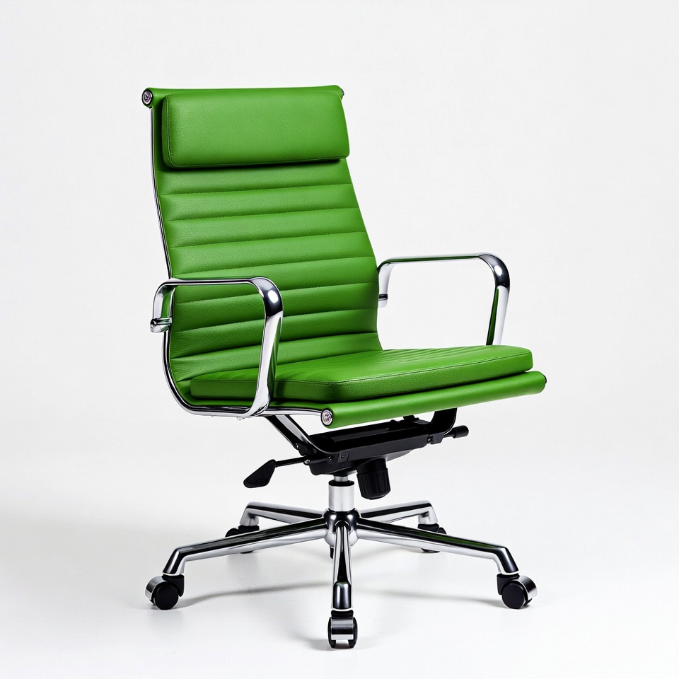 Eames chair, adjustable chair, caster wheels, chrome arms, ergonomic chair, executive chair, five-star base, green leather, high-back chair, isolated background, leather chair, modern furniture, office chair, swivel chair, tufted upholstery, green chair