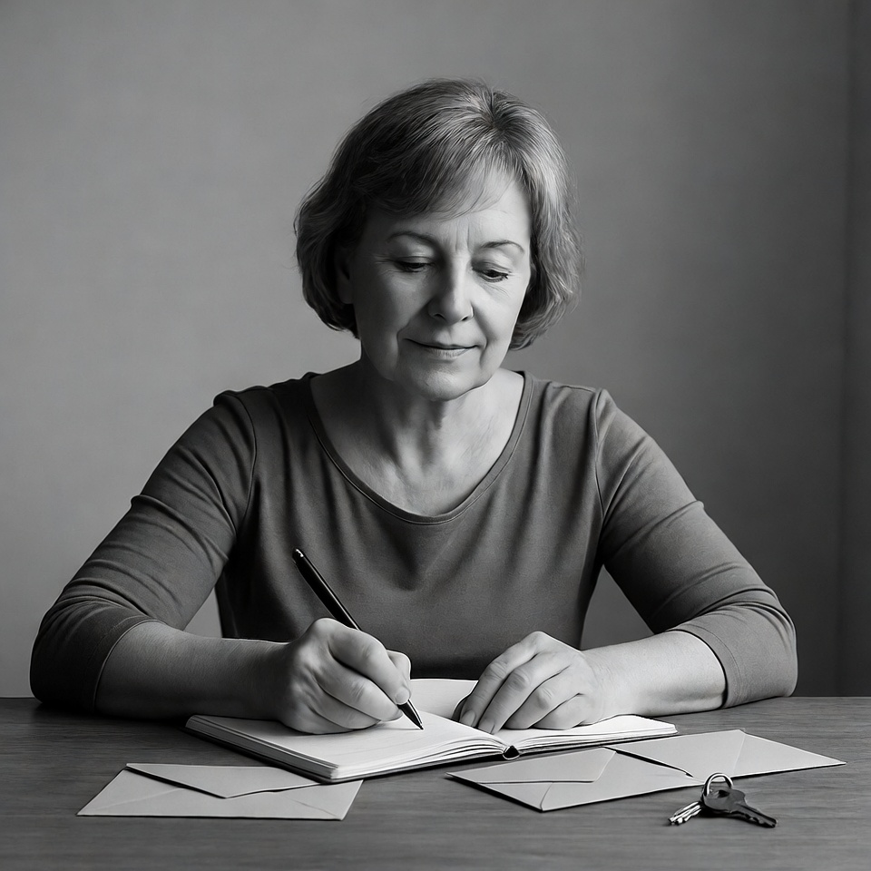 A middle-aged White woman with short gray hair sits at a wooden table, writing in an open notebook with a pen. She wears a long-sleeved gray top and looks focused on her task. Several open envelopes and keys are scattered on the table in front of her.