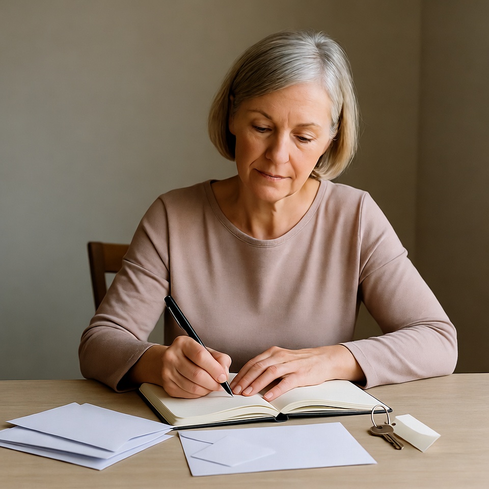 An elderly White woman with short gray hair sits at a wooden table, writing in an open notebook with a black pen. She wears a long-sleeved beige top and focuses intently on the page. Stacks of white envelopes, keys, and an eraser are placed nearby on the table.