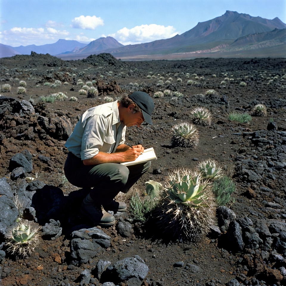 White, agave plants, arid terrain, black rocks, cap, desert plants, field research, geology, khaki clothing, kneeling, lava field, male, mountains, notebook, outdoors, scientist, snow-capped peaks, sparse vegetation, volcanic landscape, writing, man