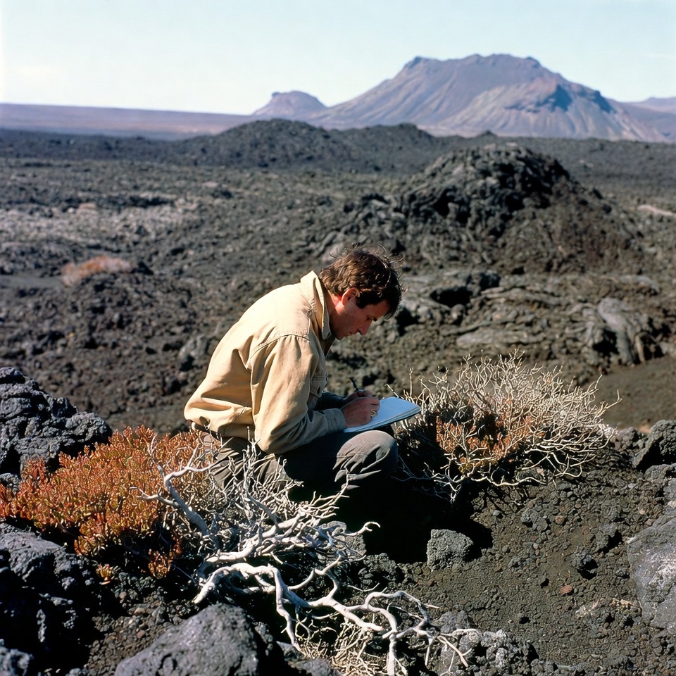 A man with brown hair kneels on black lava rock terrain, writing in a notebook beside sparse bushes. He wears a tan jacket and gray pants amid rugged volcanic landscape with distant mountains. The scene features dark lava fields and scattered vegetation under a clear sky.
