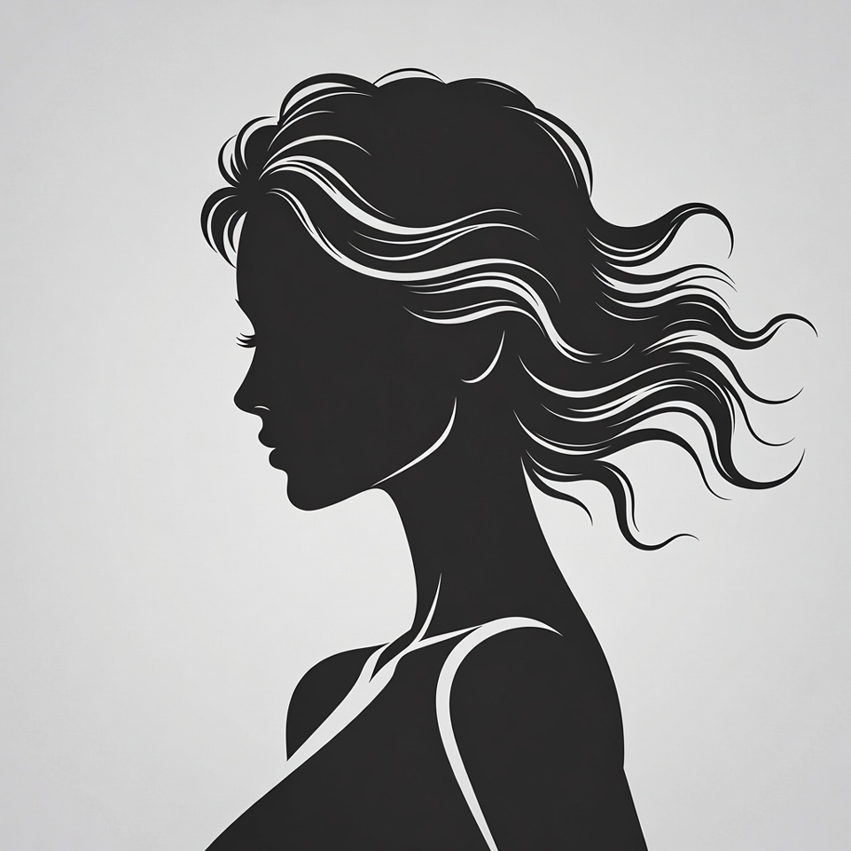 A black silhouette illustration of a woman's profile against a light gray background. She has long, wavy hair flowing dynamically to one side. The design features detailed outlines of her face, neck, and curvaceous figure.
