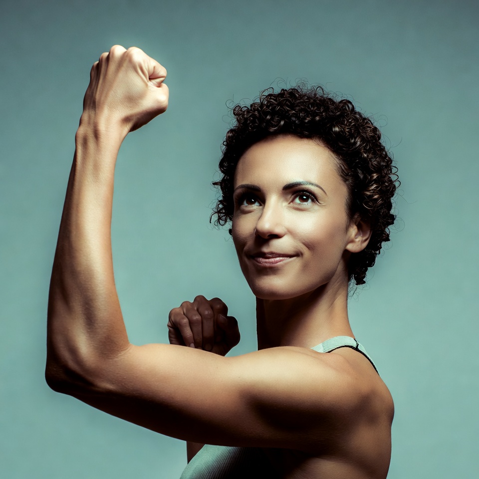 A fit African-American woman with curly short hair flexes her muscular right arm strongly. She smiles confidently with her left hand also posed near her side. She wears a gray tank top against a plain blue background.