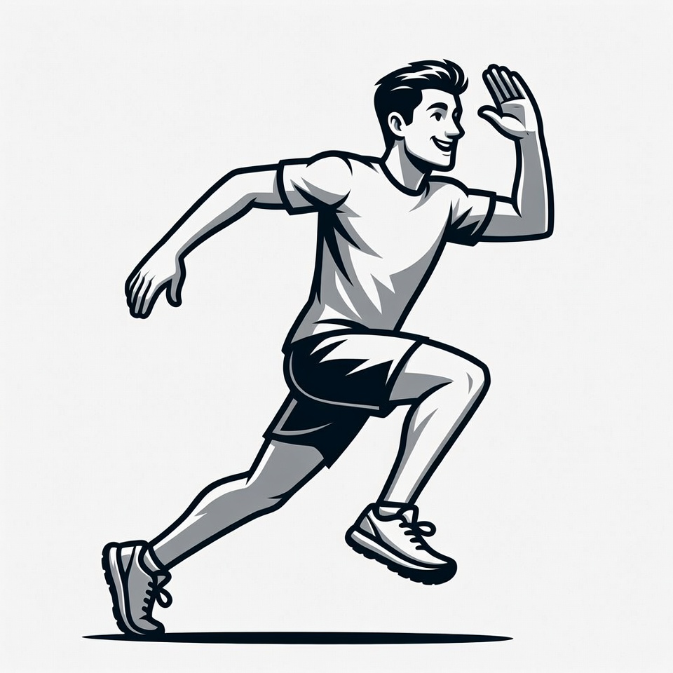 arm raised, athlete, black and white, clipart, dynamic pose, energetic, exercise, fitness, healthy lifestyle, illustration, isolated background, jogging, line art, male, man, muscular, running, shorts, sneakers, sports, t-shirt, vector, workout, young man, running man