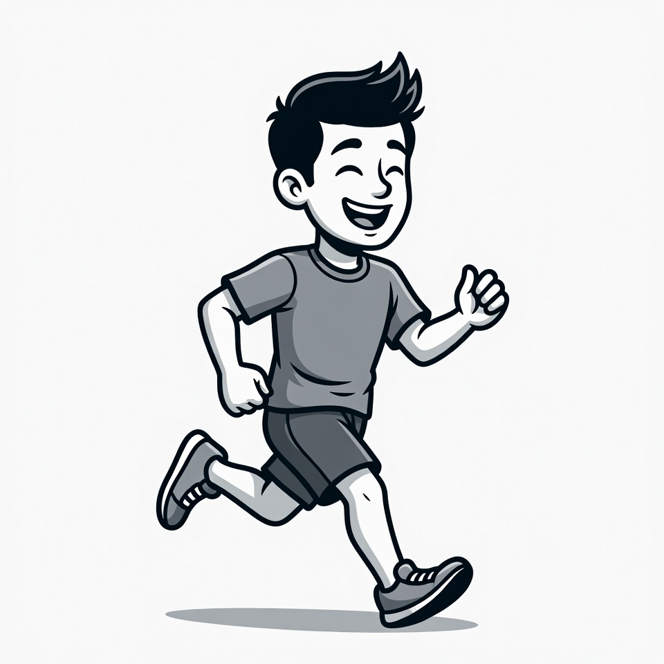 A cartoon boy with short black hair runs energetically while smiling. He wears a gray t-shirt and shorts with sneakers on an isolated white background. His arms pump and one hand is raised in excitement.