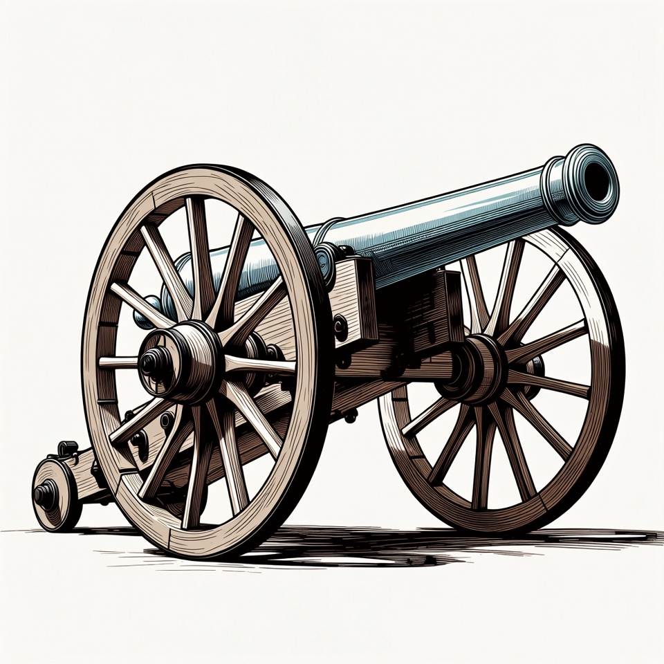 artillery, clipart, drawing, gun barrel, historical weapon, isolated background, military history, old cannon, sketch style, vector illustration, vintage cannon, war cannon, wooden wheels, cannon
