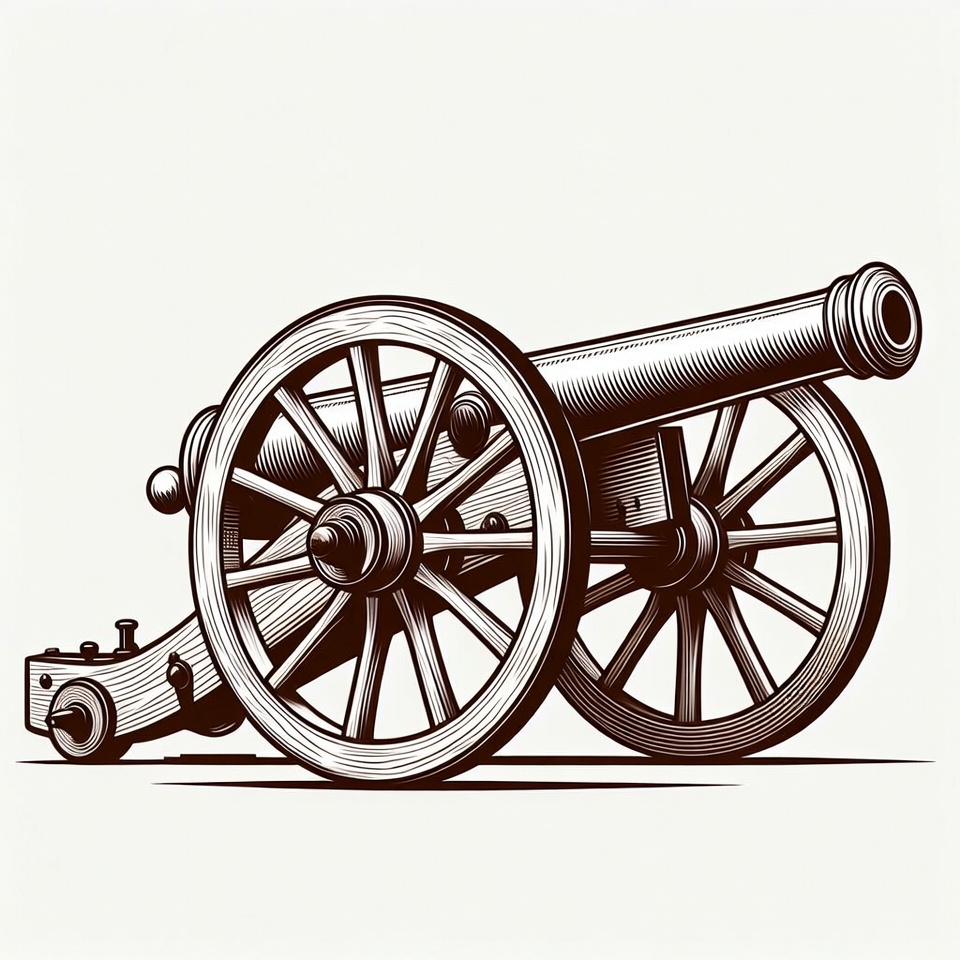 artillery, barrel, clipart, engraving style, gun, historical, illustration, isolated background, line art, military, old cannon, vector, vintage cannon, weapon, wooden wheels, cannon