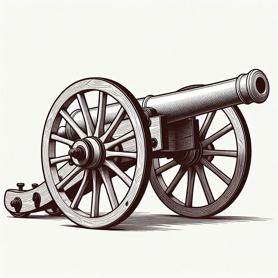 artillery, black and white, clipart, engraving, field artillery, historical weapon, illustration, isolated background, line art, military, old cannon, vintage cannon, war cannon, wooden wheels, cannon