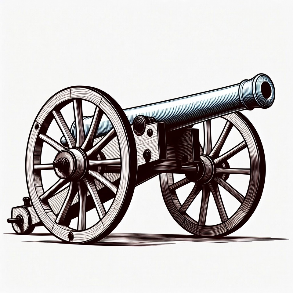 artillery, barrel, carriage, clipart, drawing, gun, history, illustration, isolated background, line art, military, sketch, vector, vintage cannon, war, weapon, wooden wheels, cannon