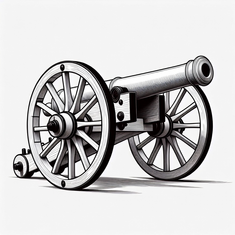 artillery, black and white, civil war cannon, clipart, historical weapon, illustration, ink drawing, isolated background, line art, metal barrel, military history, old cannon, vintage cannon, wooden wheels, cannon