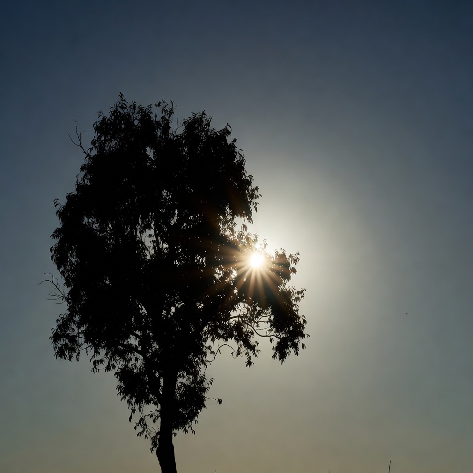 backlit, blue sky, branches, bright sun, isolated background, landscape, leaves, nature, outdoors, rays, silhouette, sky, starburst, sun, sunrise, sunset, tree