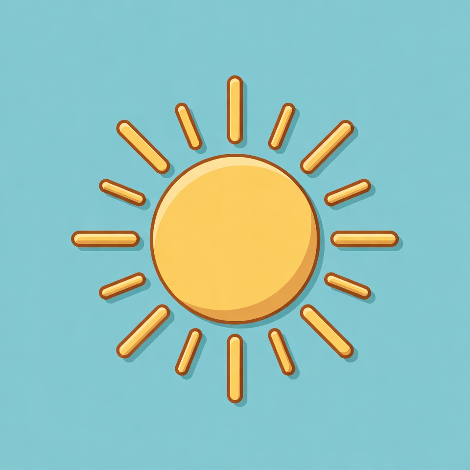 A vibrant yellow sun with radiating rays is centered on a solid light blue background. The sun features a smooth circular face and pointed orange rays extending outward. The illustration has a clean, cartoonish style with bold outlines.