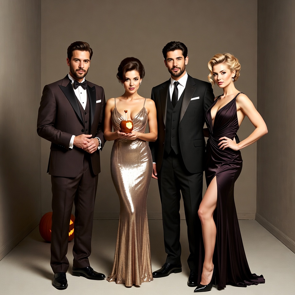 Two men in tuxedos and two women in glamorous dresses pose together on a plain background. One woman holds a small golden pumpkin. They wear formal attire with elegant shoes suitable for a Halloween event.