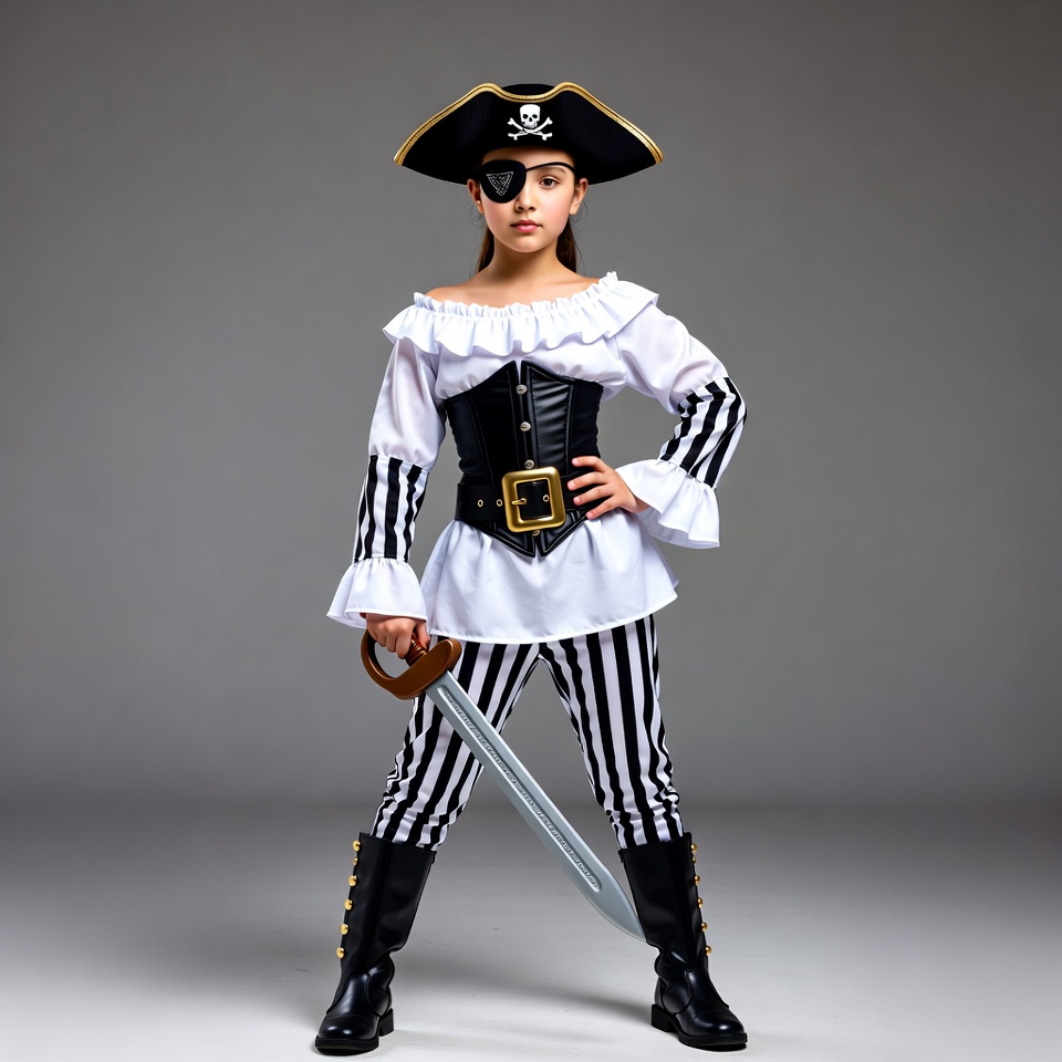 A young girl dressed in a pirate costume stands confidently on a gray background. She wears a black pirate hat with skull emblem and eyepatch, white ruffled blouse, black corset, striped pants, and black boots. She holds a toy sword in a dramatic pose.