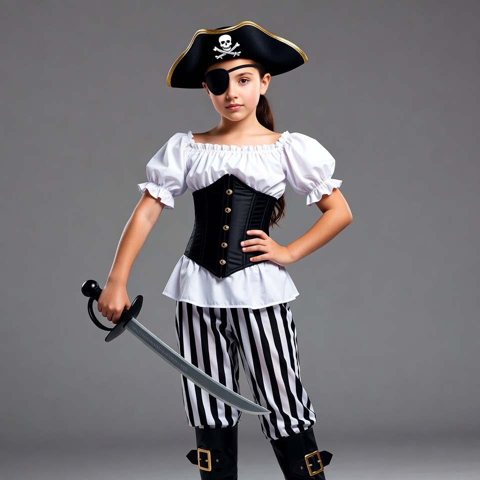A young girl with dark hair in a ponytail wears a pirate costume featuring a tricorn hat with skull emblem, eyepatch, white off-shoulder blouse, black corset, striped pants, and black boots. She stands confidently on a gray background, holding a silver sword in her right hand with her left hand on her hip. Her expression is serious and determined.