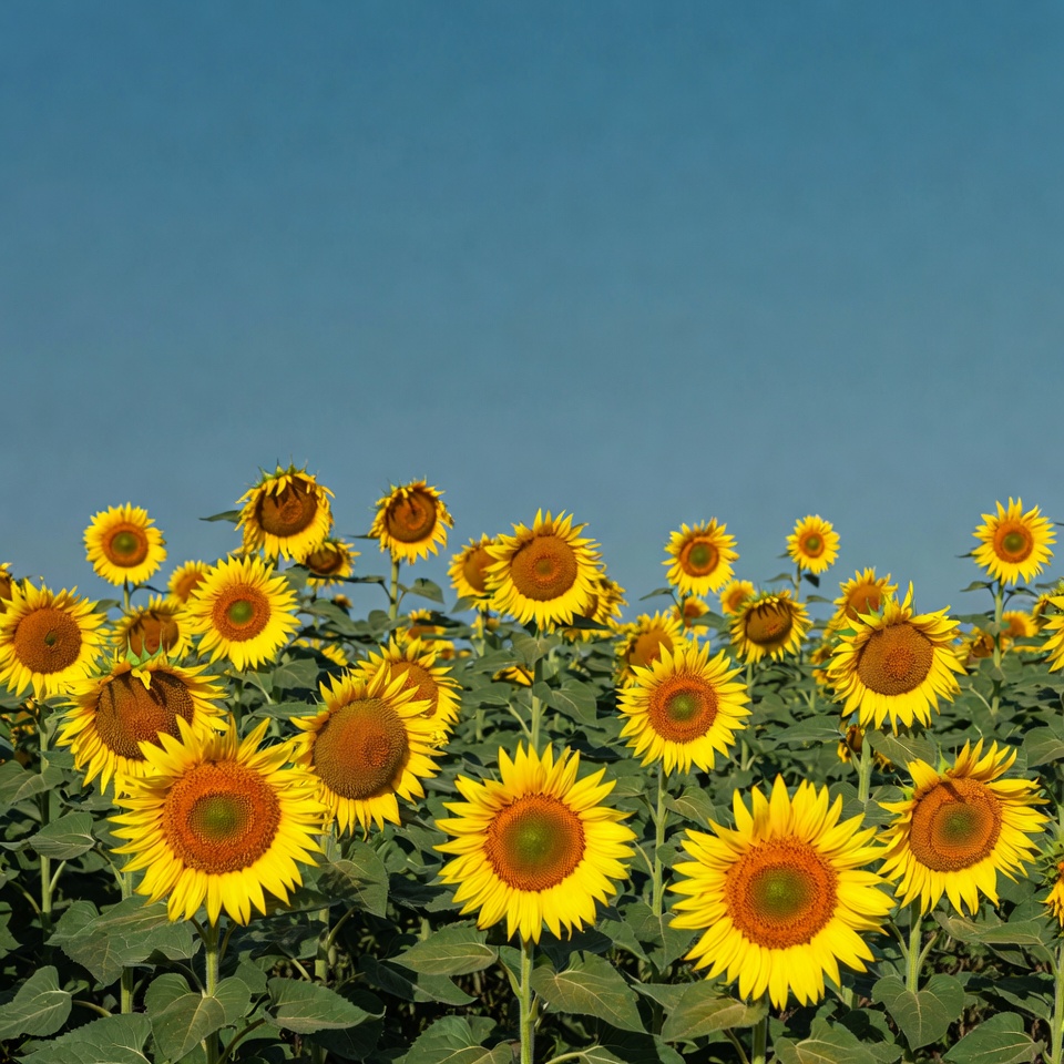 agriculture, blooms, blue sky, bright, crop, daylight, farm, field, floral, fresh, garden, golden, green leaves, horizontal, isolated background, landscape, natural, nature, outdoor, petals, plants, sky, stems, summer, sunflower field, sunny, vibrant, yellow flowers, sunflowers