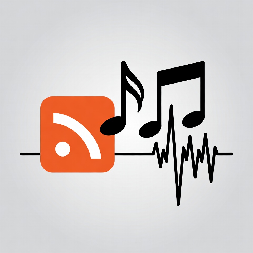 An orange RSS feed icon with a white signal symbol sits on a light gray background. Surrounding it are black musical notes and a sound waveform line. The graphic elements are simple and bold, arranged in a flat design style.