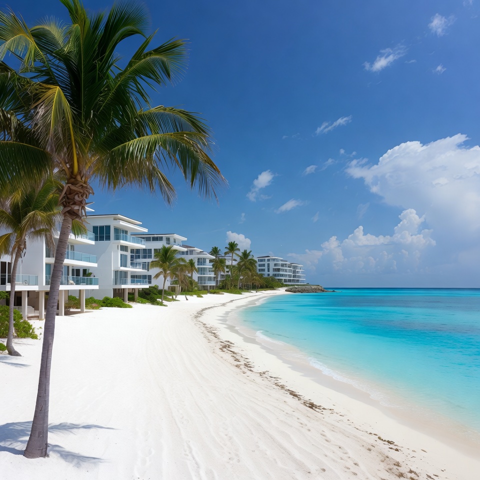 A pristine white sand beach curves along turquoise ocean waters under a clear blue sky with scattered clouds. Tall palm trees line the shore in front of modern white multi-story villas perched on the edge. The scene features lush greenery and a serene tropical shoreline.