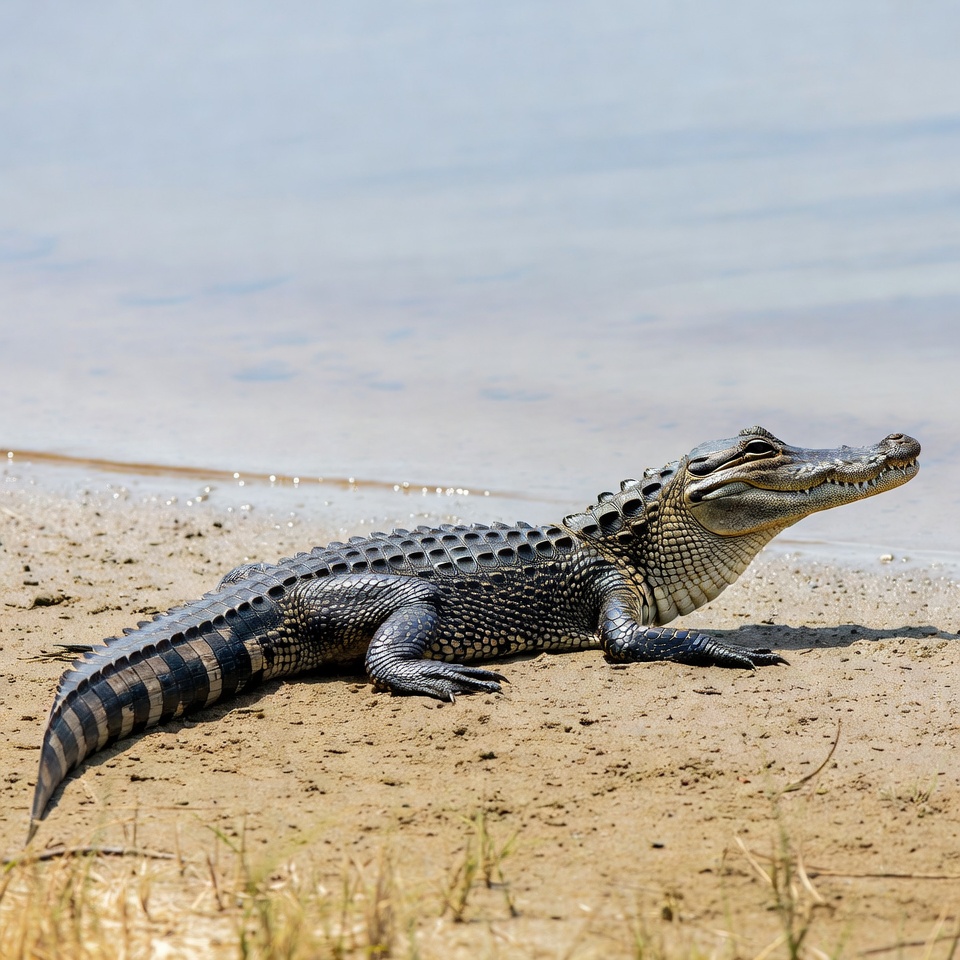 animal, claws, crocodile, lying down, nature, outdoors, reptile, resting, riverbank, sandy shore, scales, sharp teeth, swamp, tail, water edge, wildlife, alligator