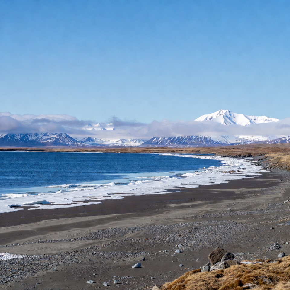 arctic shore, black sand beach, blue sky, clouds, cold landscape, glacier mountain, grass, ice chunks, iceland scenery, icy water, mountain range, ocean waves, pebbles, rocky shore, shoreline, snow capped peaks, snowy mountain, volcanic beach, winter beach, arctic landscape