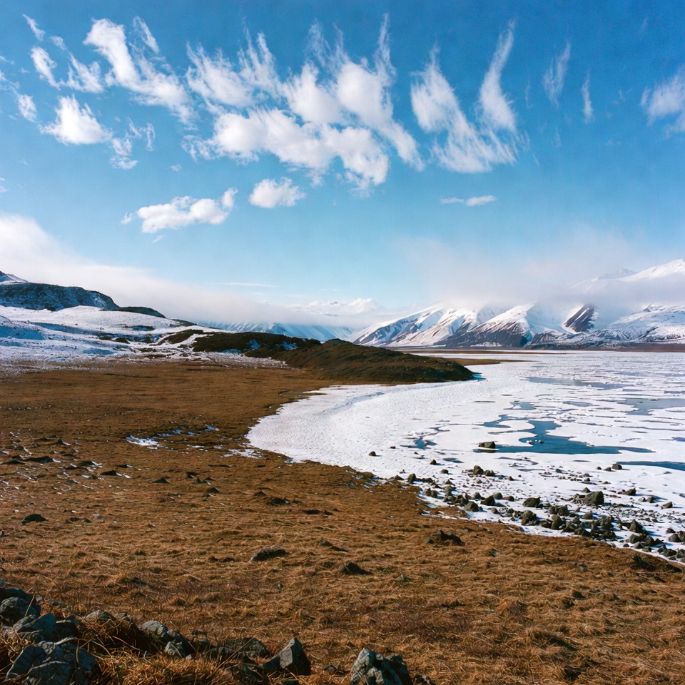 A vast frozen lake bordered by brown grassy tundra and patches of snow stretches toward distant snow-capped mountains. Wispy clouds streak across a bright blue sky above the icy landscape. Rocky outcrops dot the foreground near the water's edge.