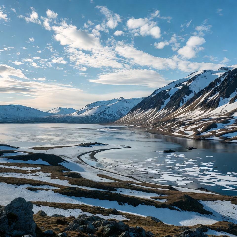 arctic scenery, blue sky, clear water, clouds, cold weather, frozen lake, glacial lake, grass slopes, high altitude, ice patches, icy water, mountain range, nature, outdoors, rocky shore, snow capped peaks, tundra, wilderness, winter landscape, snowy mountains