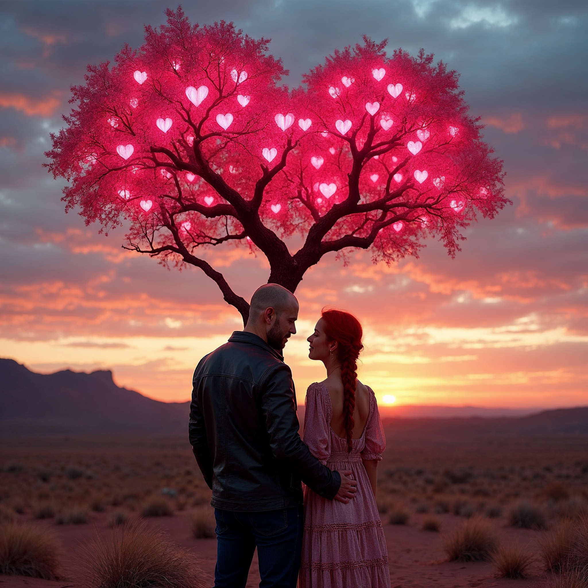 White, braided hair, desert, embrace, female, glowing tree, grass, heart tree, holding hands, landscape, leather jacket, male, man, mountains, neon hearts, pink dress, pink glow, red hair, romantic, sky, sunset, woman, couple