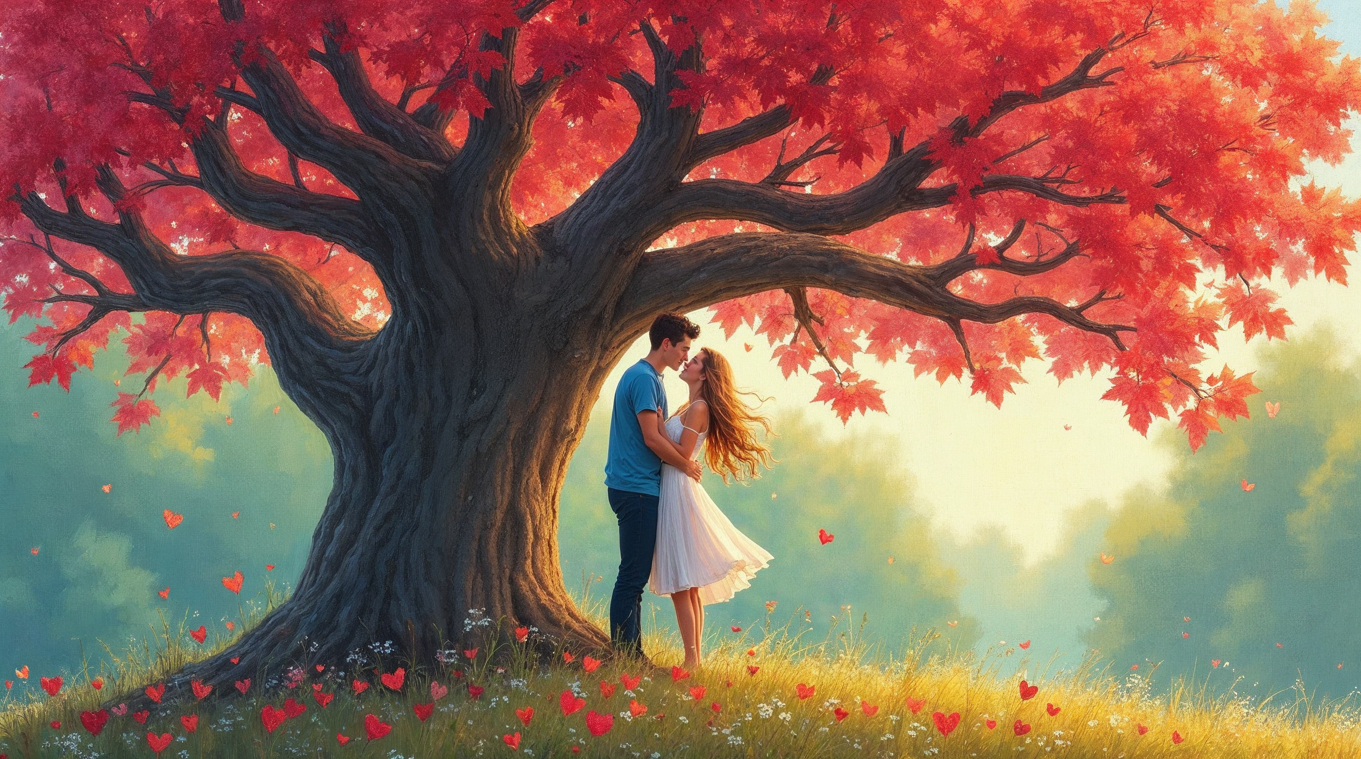 A young man and woman embrace and kiss under a large tree with vibrant red autumn leaves. The woman wears a flowing white dress, and the man is dressed in a blue shirt and jeans. They stand on a grassy field surrounded by scattered red hearts and a lush green forest in soft sunlight.