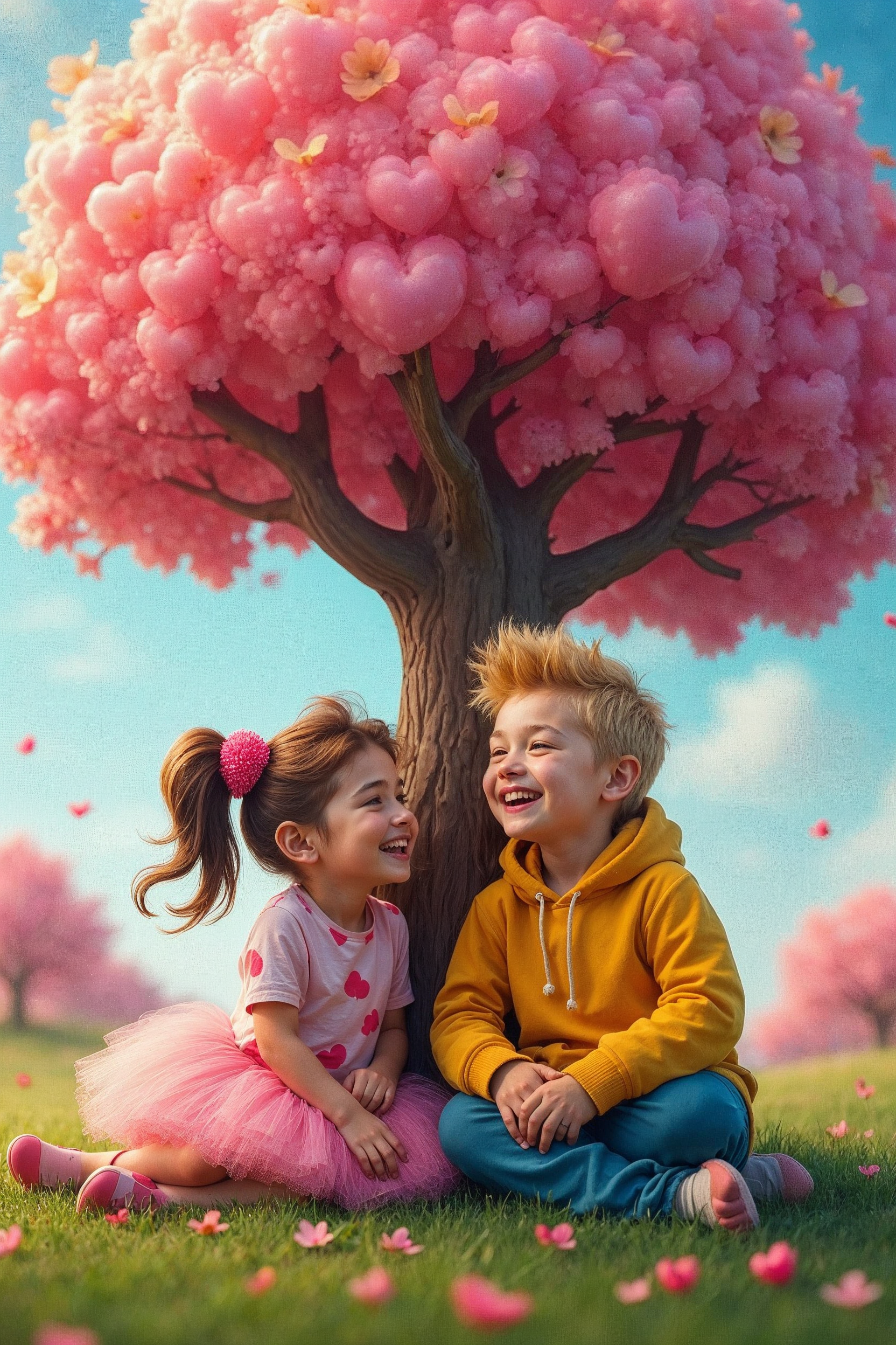 3D render, White, blonde hair, cartoon, cherry blossoms, children, digital art, fantasy tree, flowers, girl, green grass, happy, hoodie, illustration, kids, nature, outdoor, petals, pigtails, pink cherry tree, pink dress, siblings, sitting, smiling, spring, tutu dress, yellow hoodie, boy