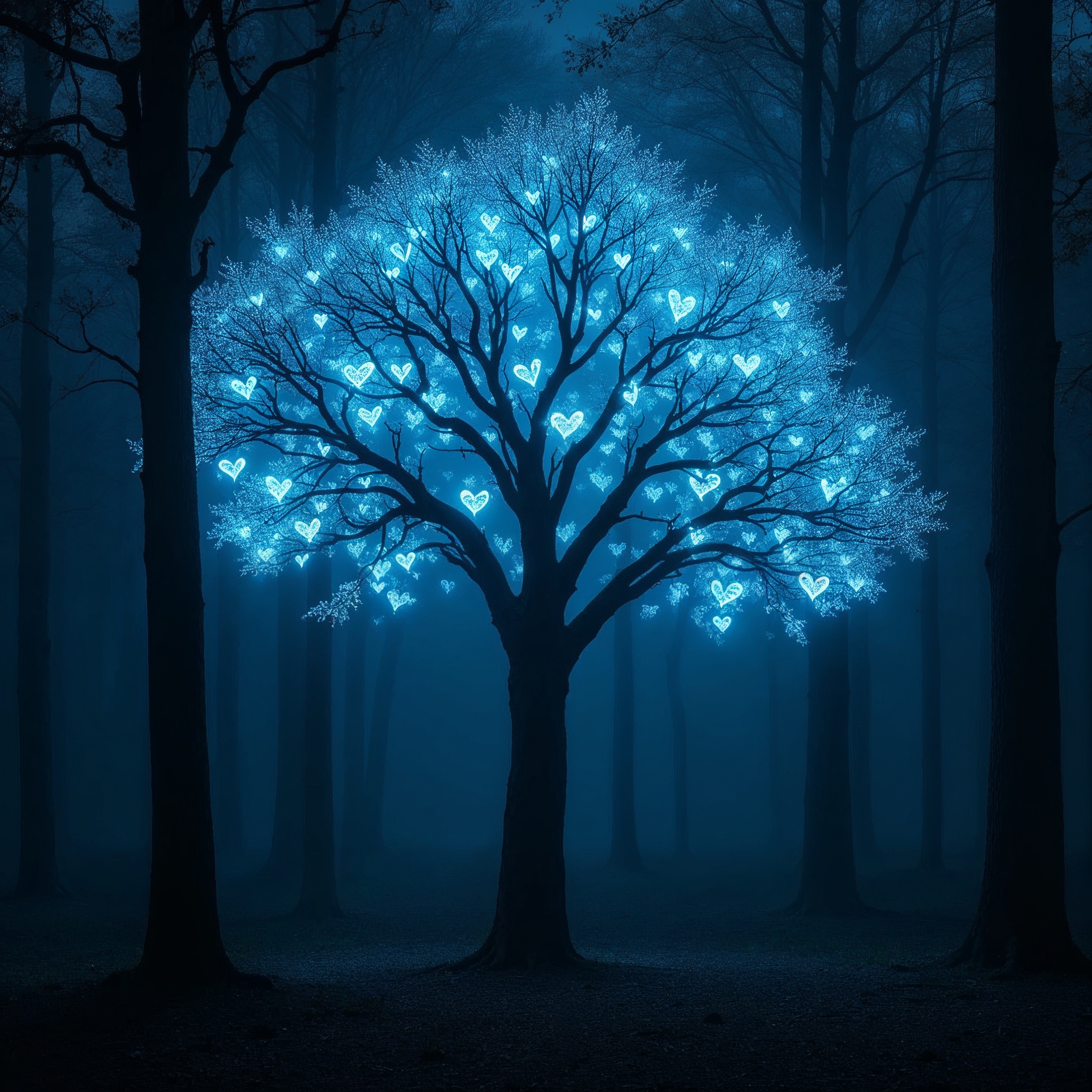 A large tree with branches covered in glowing blue heart shapes stands prominently in a dark, misty forest. Surrounding trees are silhouetted against the night sky, emphasizing the central tree's neon blue illumination. The scene features a magical, ethereal glow from the heart leaves.