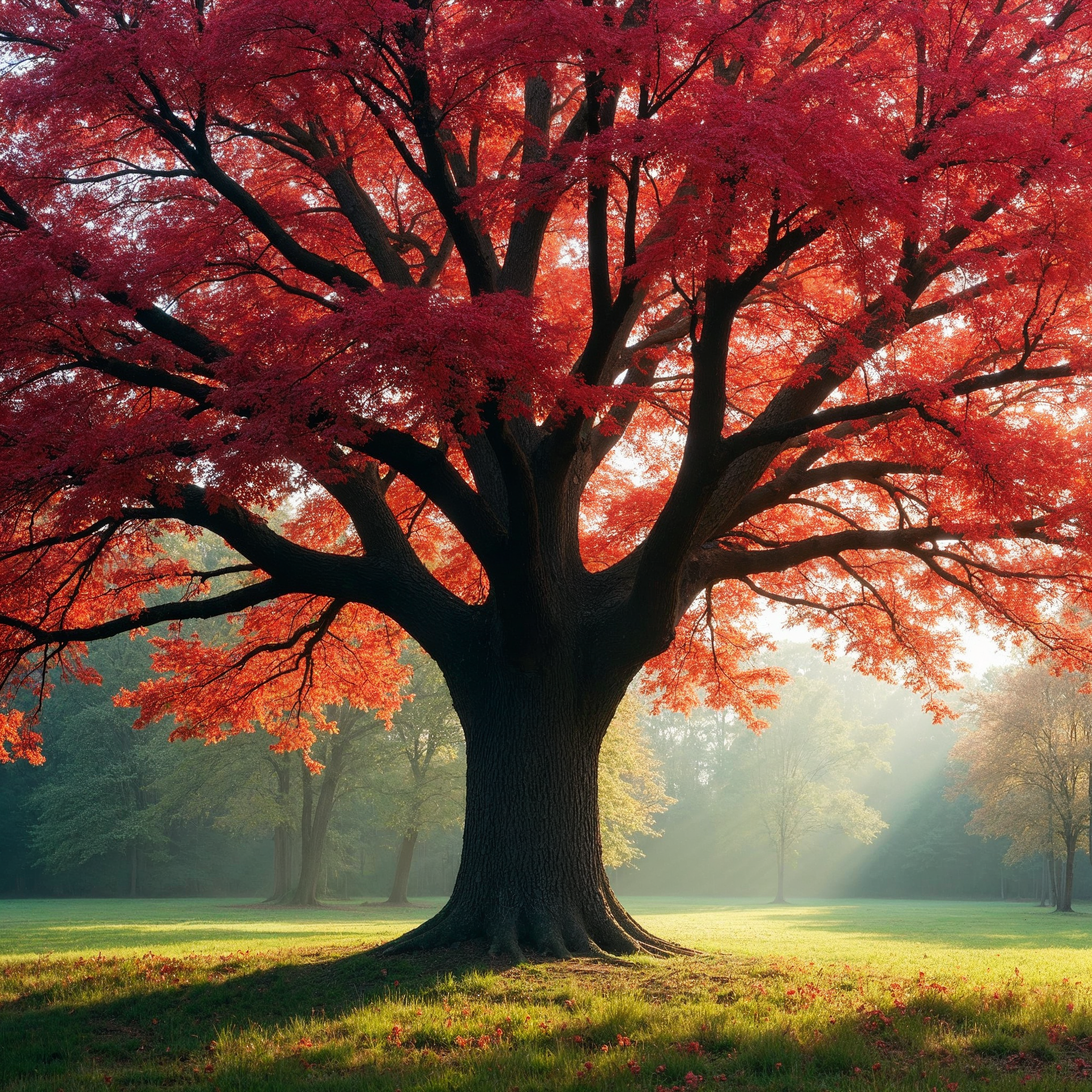 autumn leaves, autumn park, bright leaves, fall colors, fall foliage, foliage, golden light, green grass, maple leaves, nature scene, outdoor tree, park landscape, red tree, seasonal tree, sunlight rays, tree in field, tree trunk, vibrant red, woods background, red maple tree